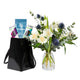 A clean modern arrangement of alstroemeria lilies, tulips and seasonal flowers in a petite vase.
