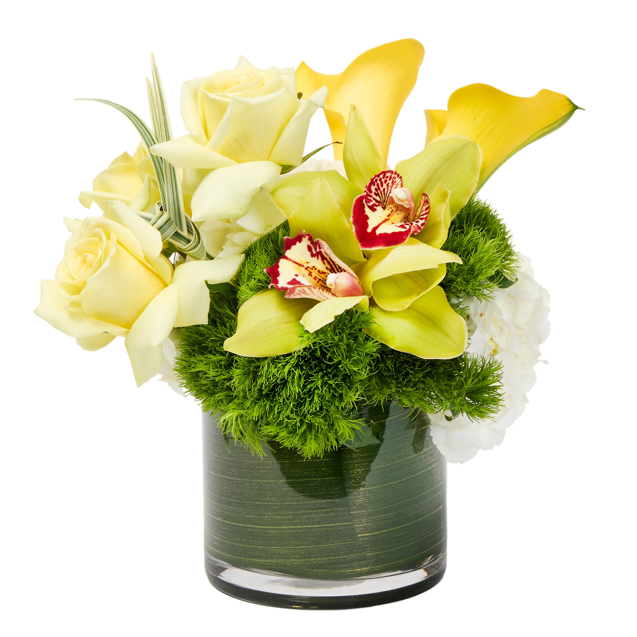 This modern arrangement is designed with yellow mini calla lilies, cymbidium orchids, roses, trick and hydrangeas, great for conventions and events. non-fragrant and long lasting Approx. 9"x 9" available in additional colors, contact the Floral Dept for availability.  Our gifts are delivered within The Venetian...