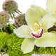 beautiful vase arrangement of dendrobium orchids and tropical foliage's.