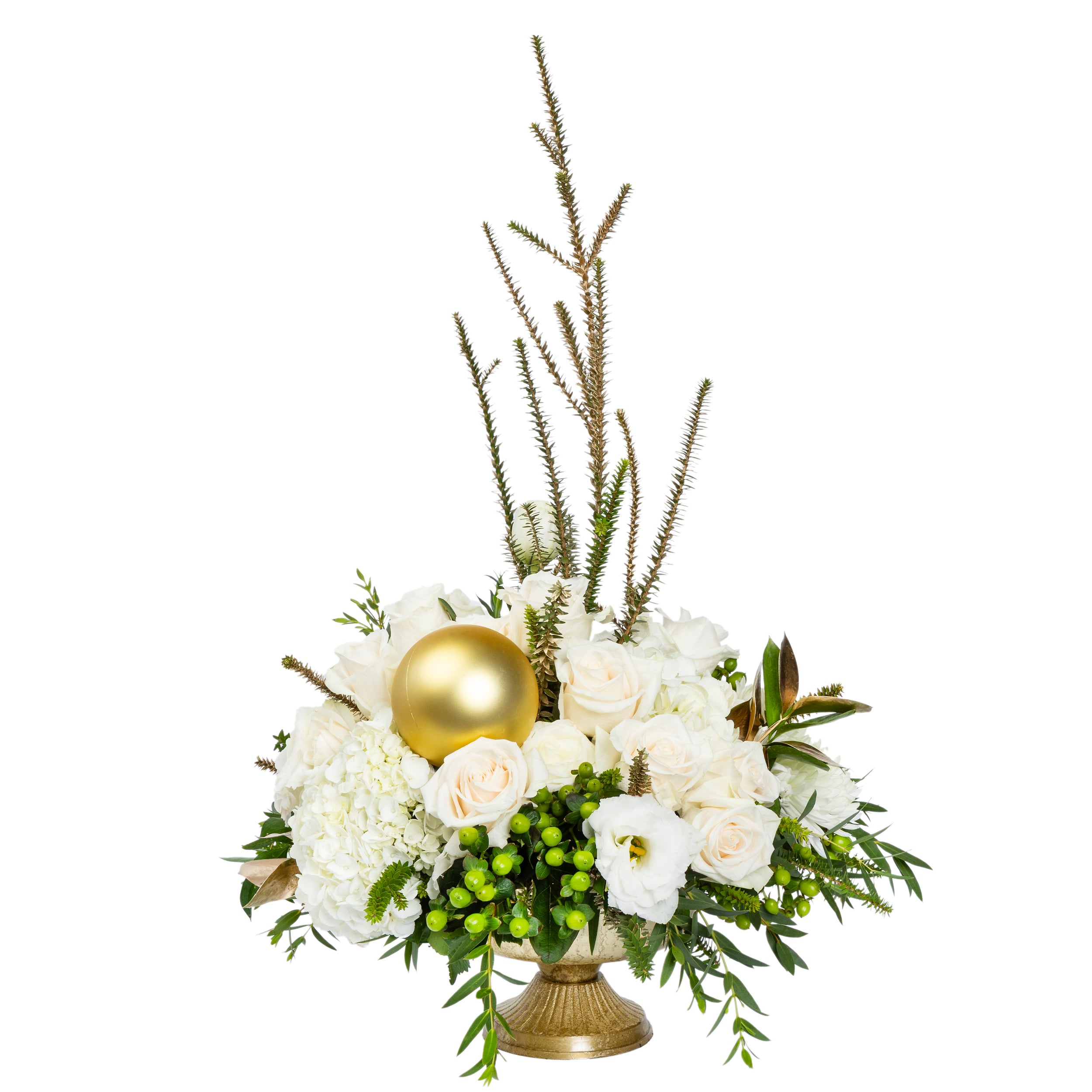 This elevated holiday floral arrangement will look and smell like the holiday weather you place it in your suite or dinner table. A mix of roses, lizzianthus, coffee bean and hydrangeas with holiday fillers and seasonal fragrant greenery designed in a gold container with holiday ornaments.
