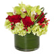 This elegant and modern floral arrangement will turn heads and create an impression. Royal Bliss is designed with Bells of Ireland and Phalaenopsis orchids and wired fern curls in a clear glass bubble bowl.
