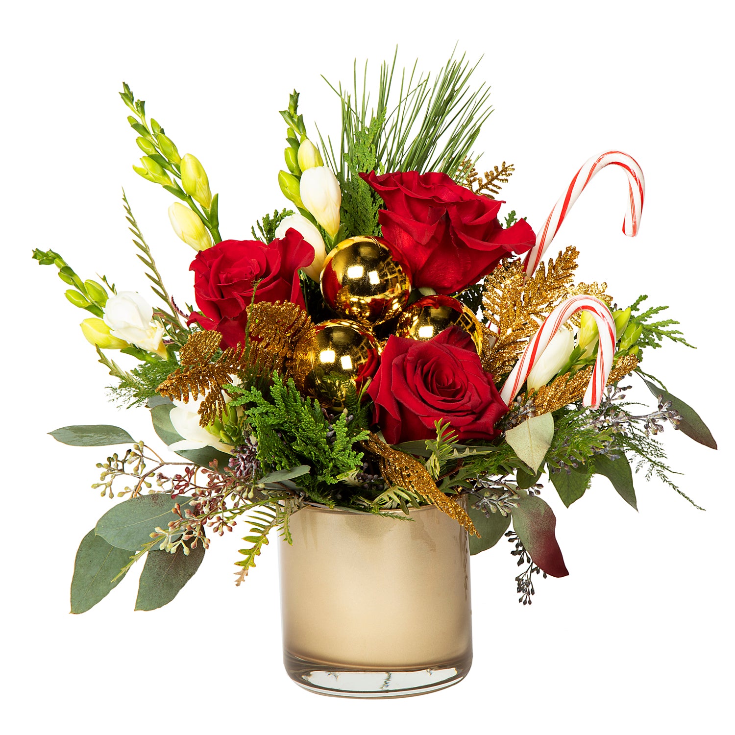 Bedside holiday arrangement of red roses, freesia and seasonal fragrant greenery. Delivered in a gold glass vase with candy canes.